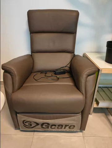 Découvrez le Fauteuil Gcare Confort Medium en cuir brun, conçu pour le confort ultime. Doté de deux moteurs, d'une têtière…